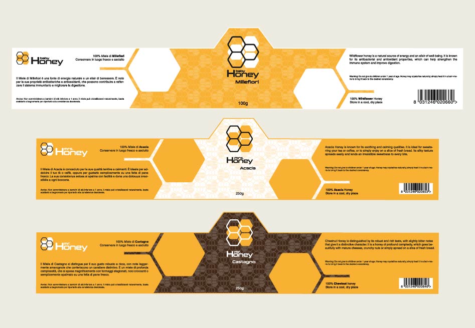 Per questo progetto, ho creato una linea di tre vasetti di miele chiamata Mr.Mrs&Baby Honey, concepita come una famiglia.